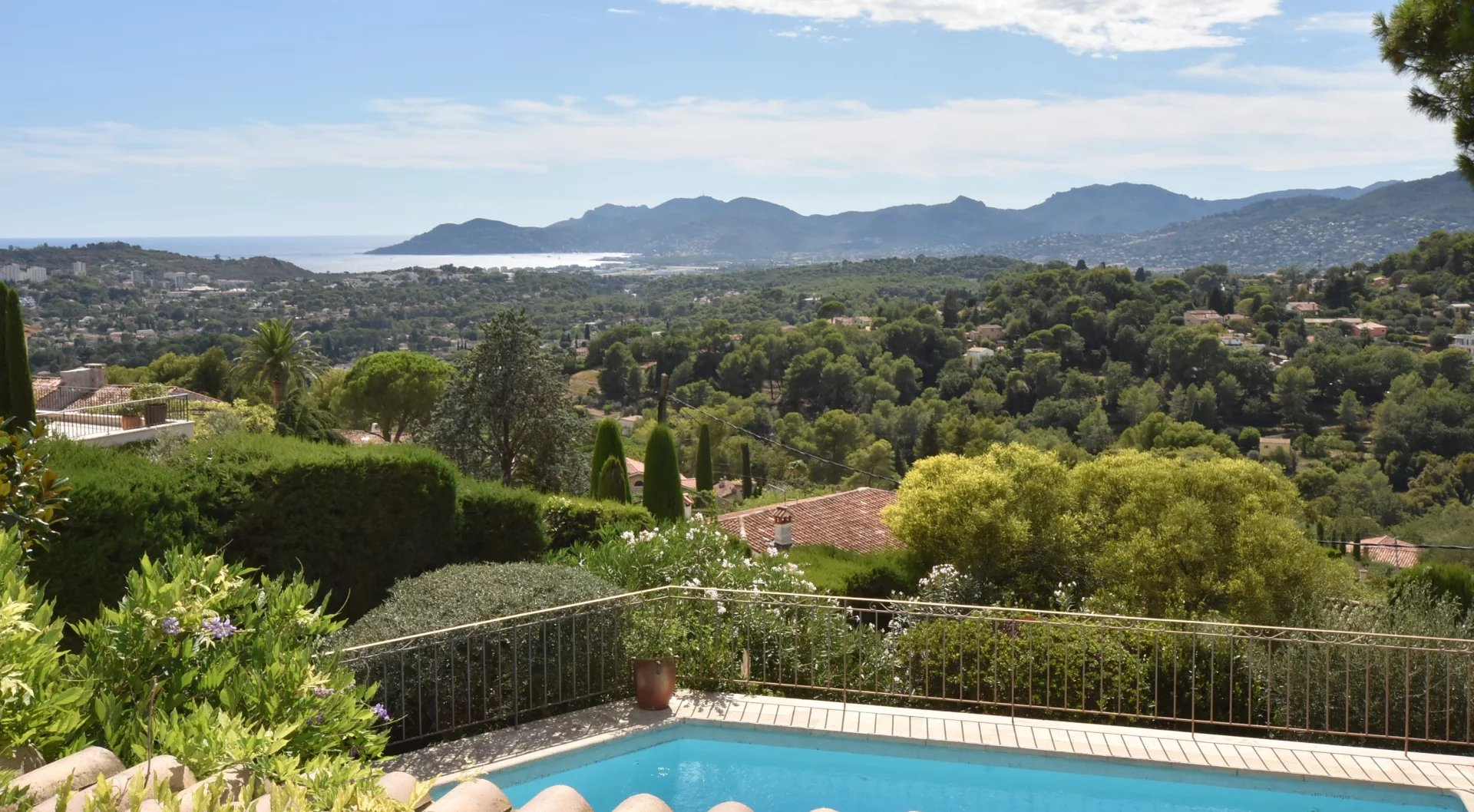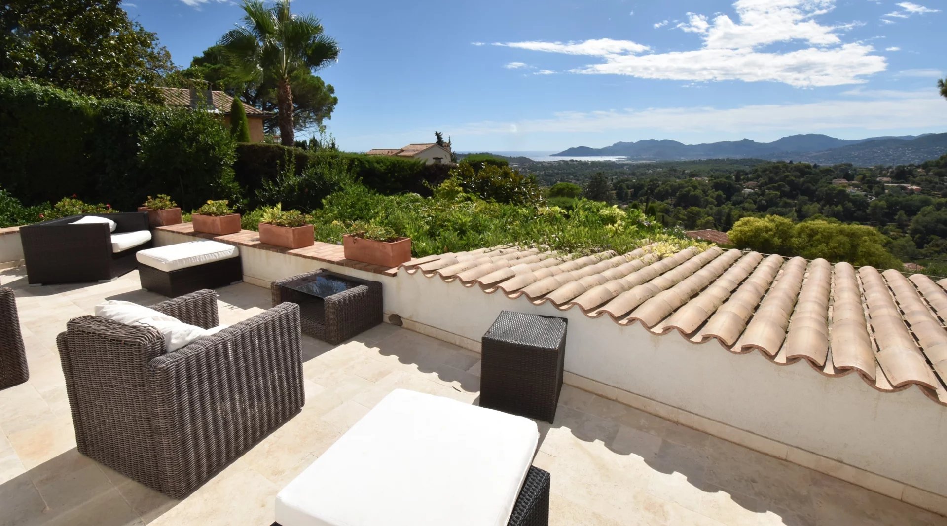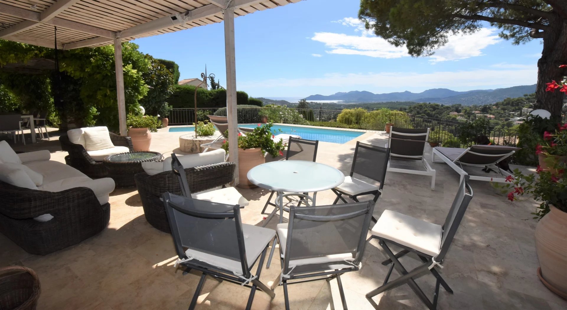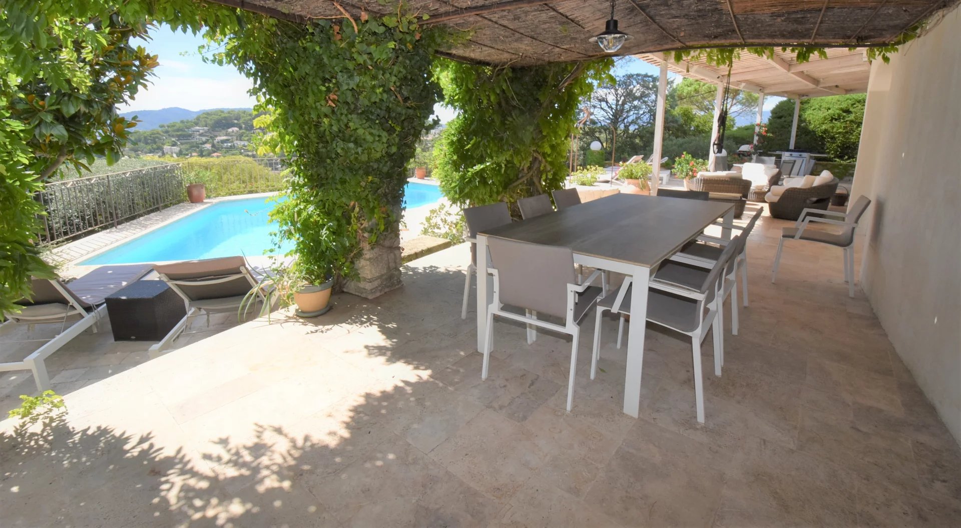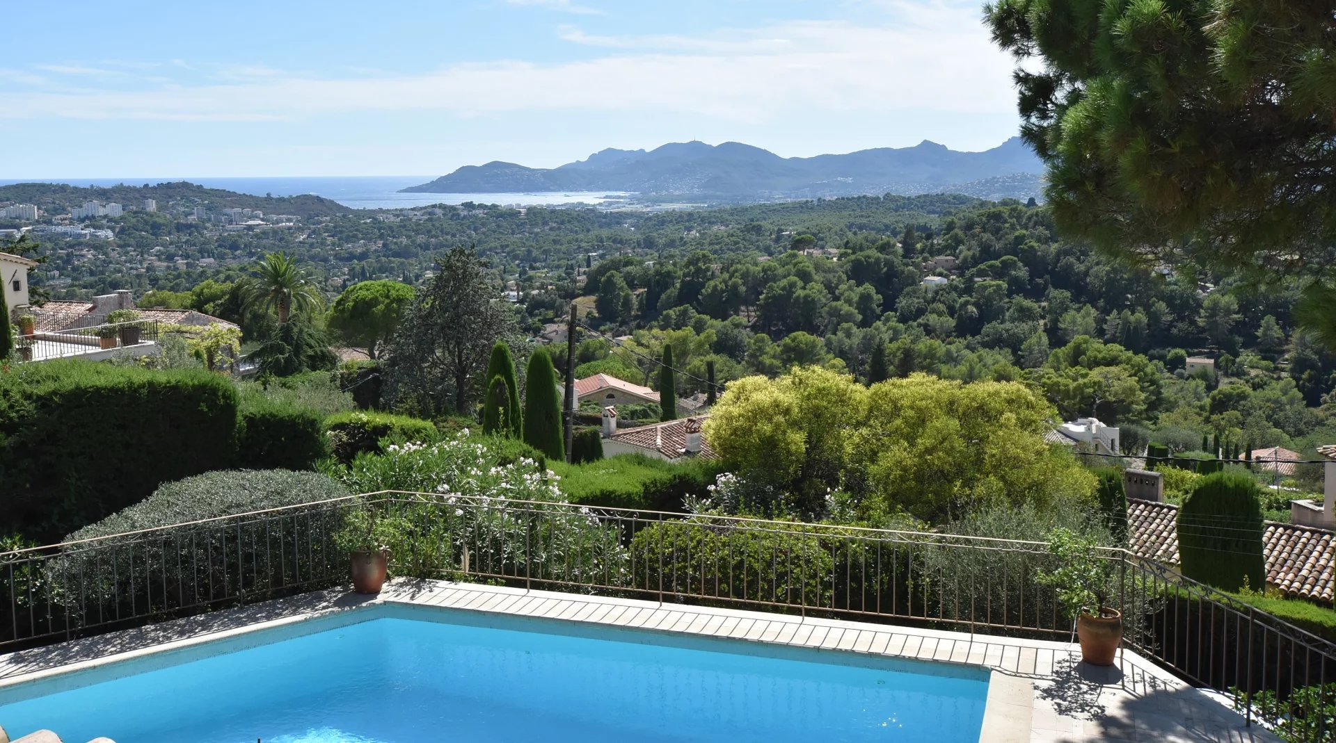 En position dominante, bénéficiant d'une vue panoramique sur la mer et les collines, villa individuelle comprenant un séjour avec une belle cuisine attenante, donnant sur une grande terrasse, en partie couverte. A l'étage, un salon avec cheminée, quatre chambres, toutes avec salles de bains ou douche et terrasses. Une dernière chambre toujours avec salle de douche, accessible par l'extérieur. Une grande buanderie, cave, garage fermé avec porte motorisée et parking avec portail électrique. Climatisation réversible dans toutes les pièces. Terrain paysager avec une belle piscine entourée d'une grande terrasse pour profiter de la splendide vue. Inclus dans le loyer, l'entretien du jardin et de la piscine.