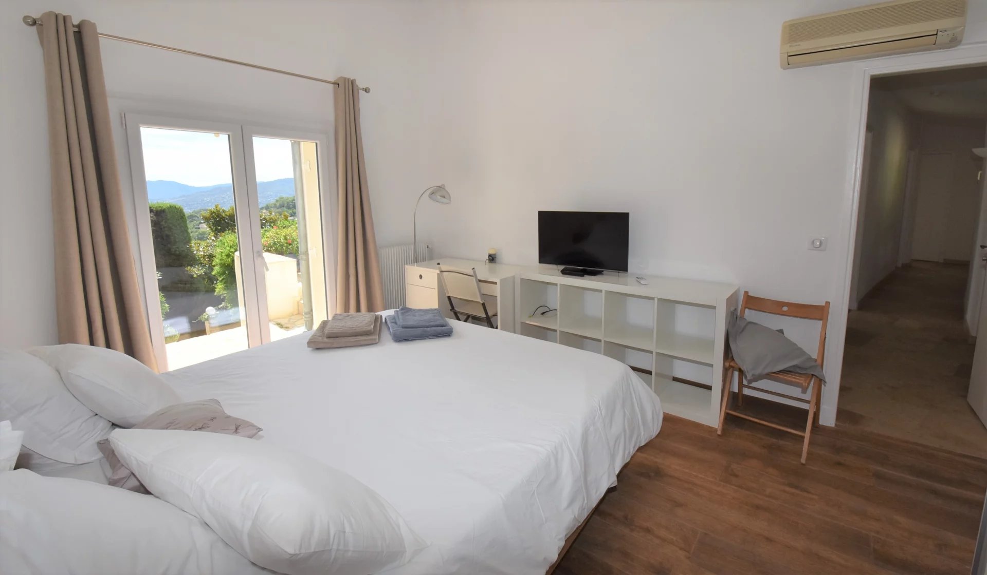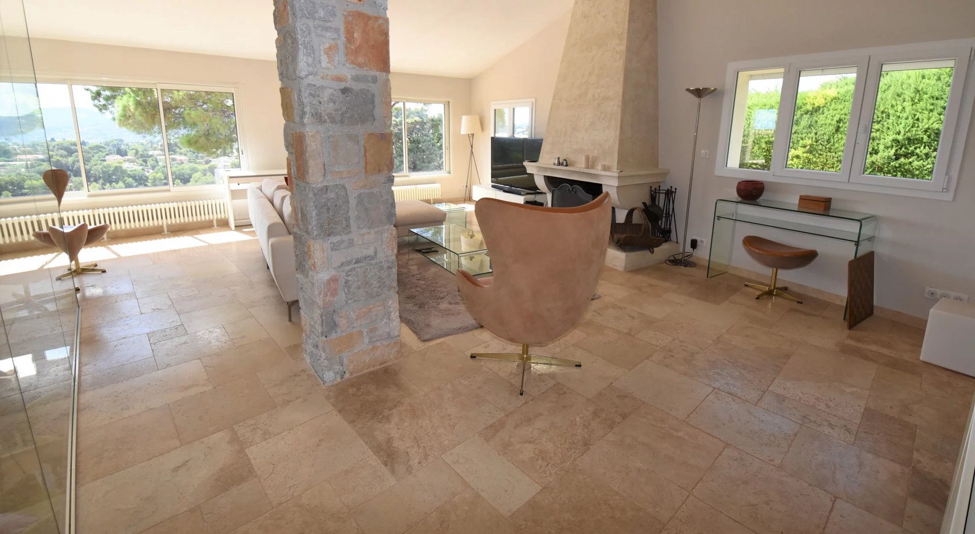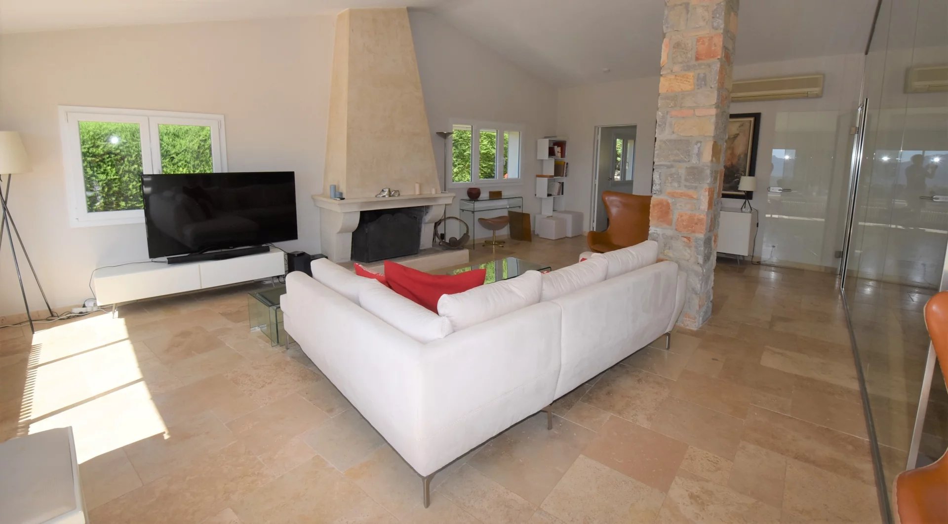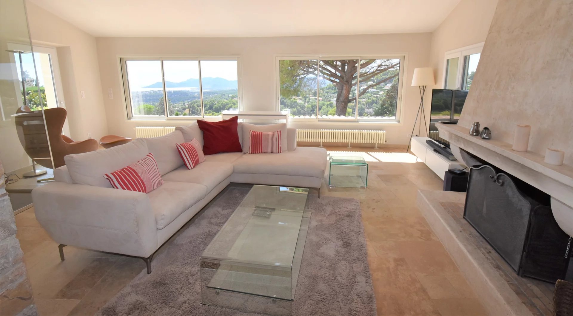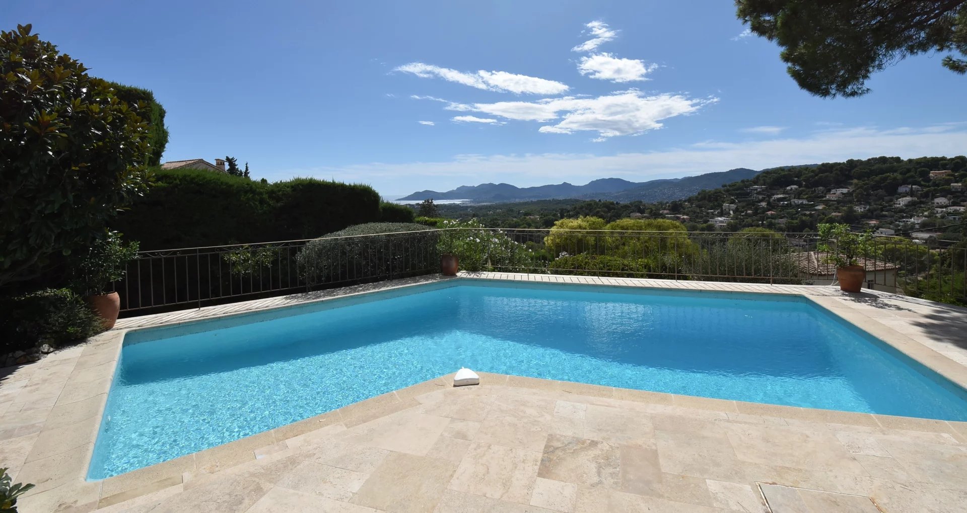 En position dominante, bénéficiant d'une vue panoramique sur la mer et les collines, villa individuelle comprenant un séjour avec une belle cuisine attenante, donnant sur une grande terrasse, en partie couverte. A l'étage, un salon avec cheminée, quatre chambres, toutes avec salles de bains ou douche et terrasses. Une dernière chambre toujours avec salle de douche, accessible par l'extérieur. Une grande buanderie, cave, garage fermé avec porte motorisée et parking avec portail électrique. Climatisation réversible dans toutes les pièces. Terrain paysager avec une belle piscine entourée d'une grande terrasse pour profiter de la splendide vue. Inclus dans le loyer, l'entretien du jardin et de la piscine.