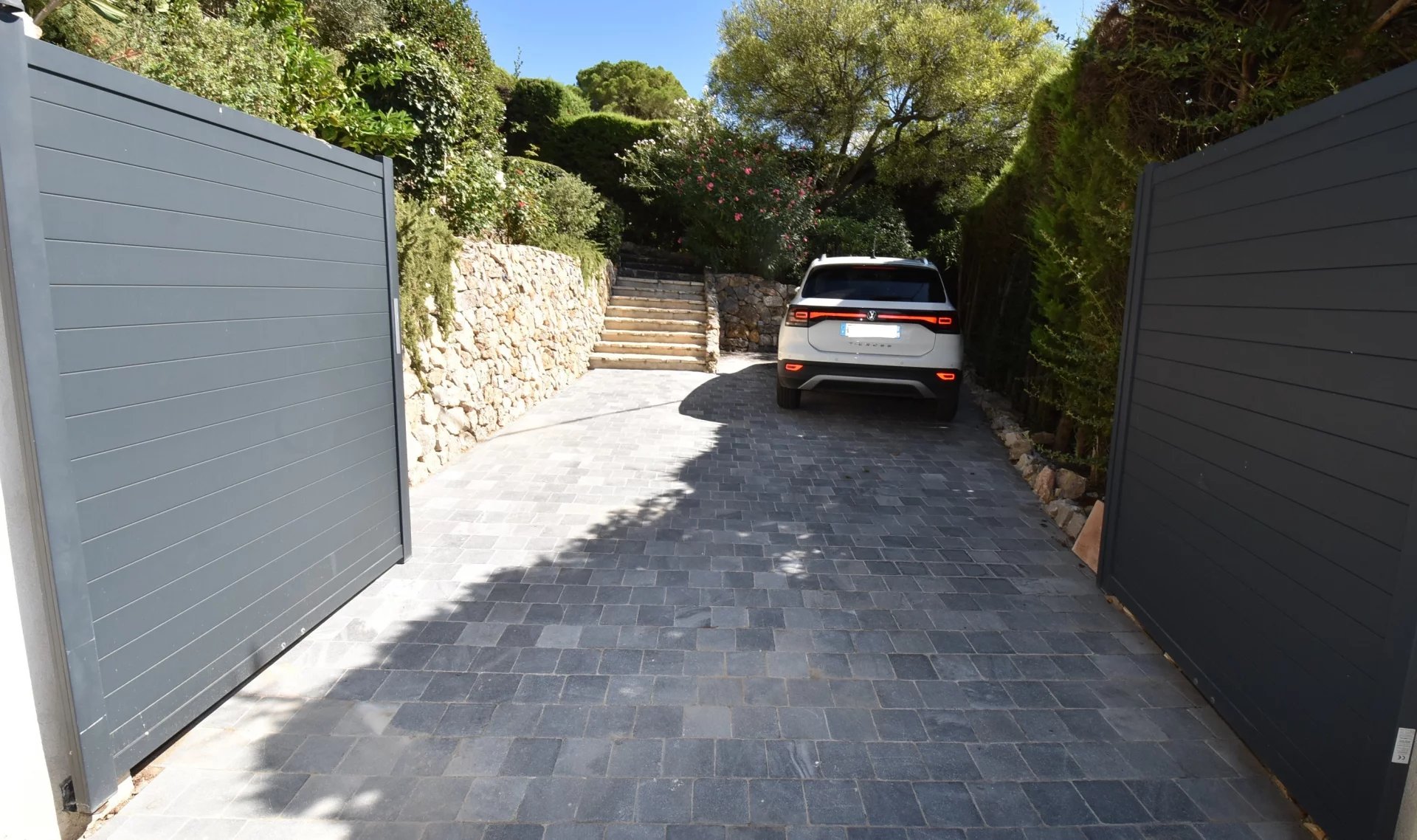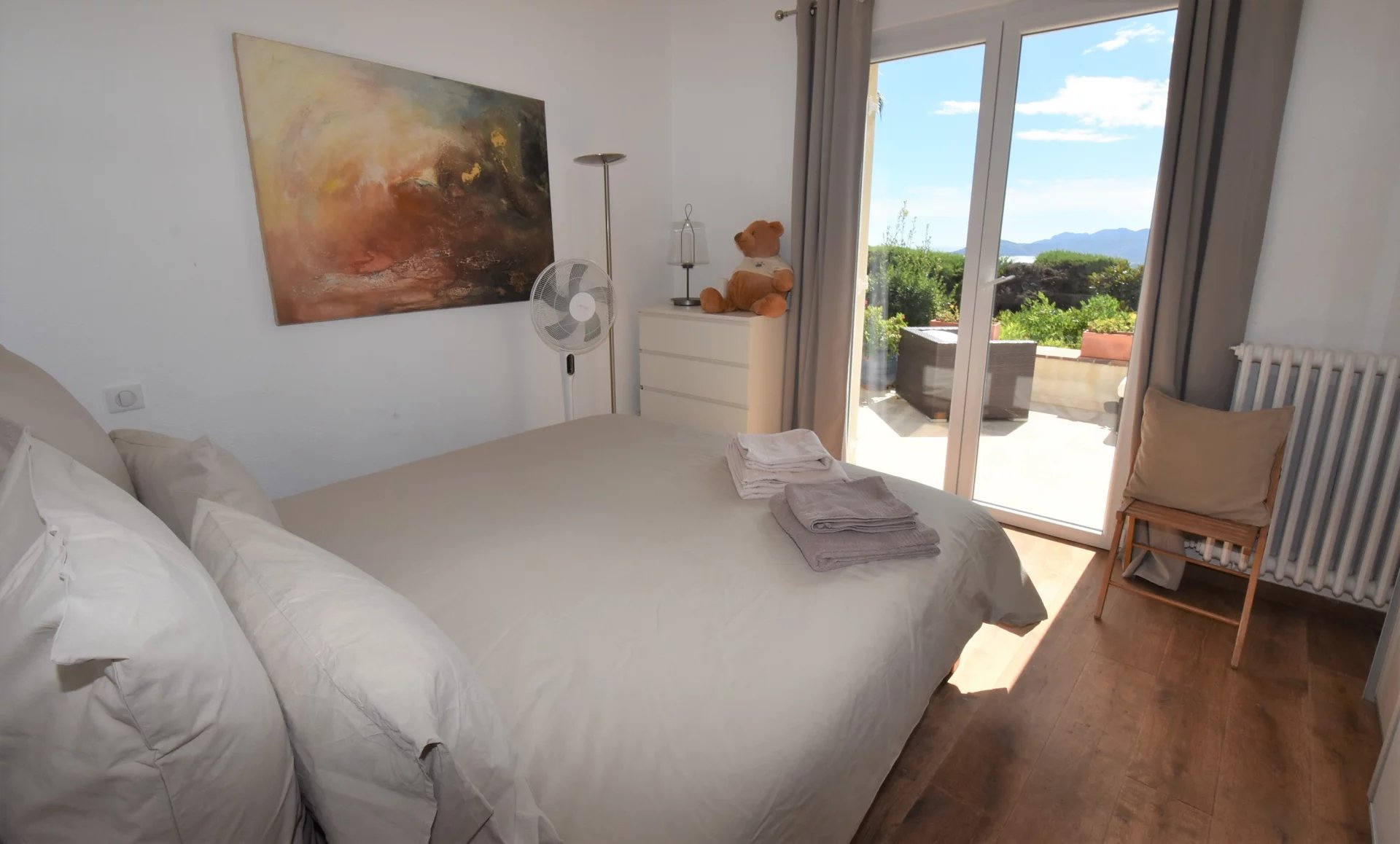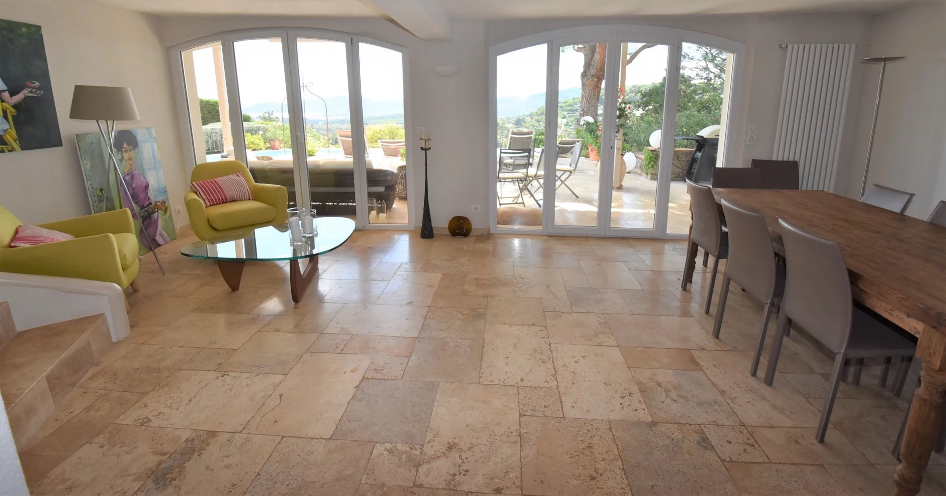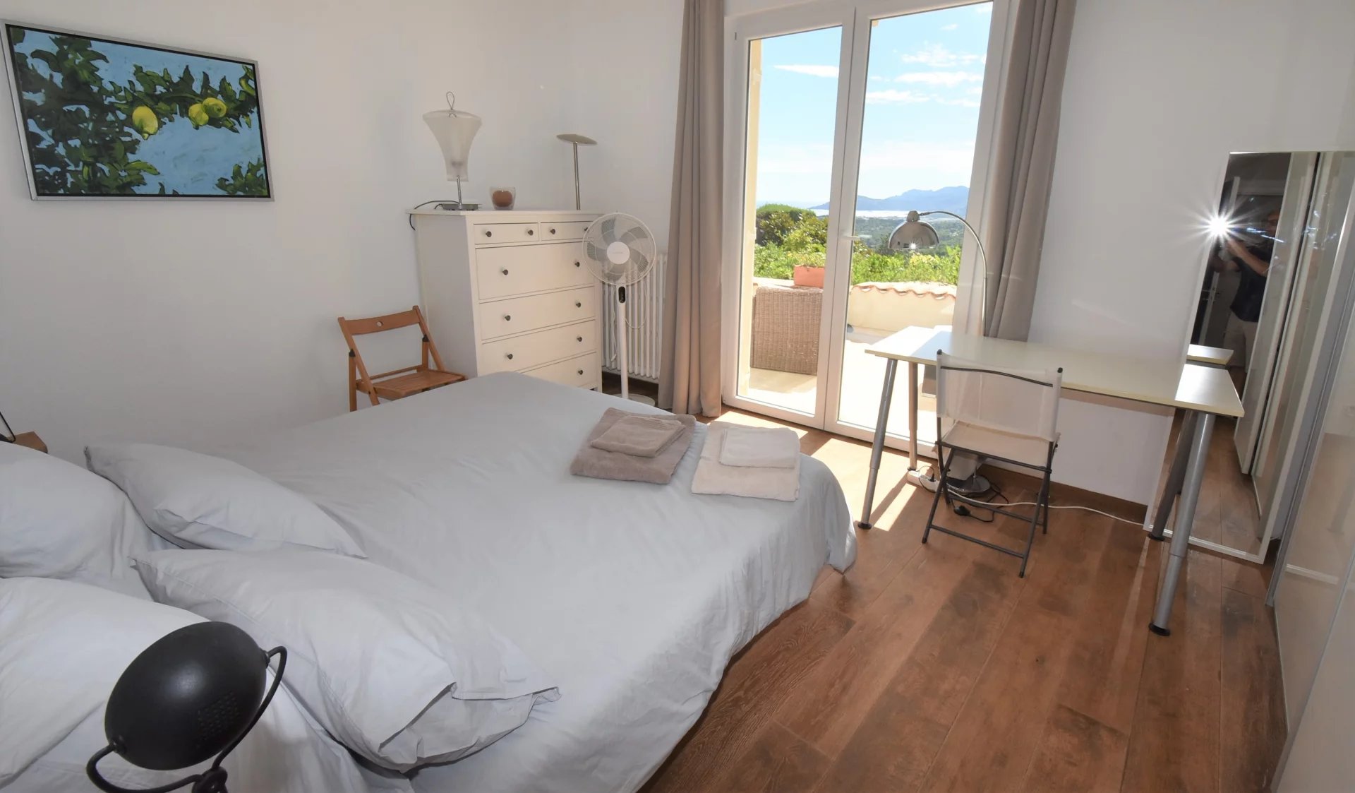 En position dominante, bénéficiant d'une vue panoramique sur la mer et les collines, villa individuelle comprenant un séjour avec une belle cuisine attenante, donnant sur une grande terrasse, en partie couverte. A l'étage, un salon avec cheminée, quatre chambres, toutes avec salles de bains ou douche et terrasses. Une dernière chambre toujours avec salle de douche, accessible par l'extérieur. Une grande buanderie, cave, garage fermé avec porte motorisée et parking avec portail électrique. Climatisation réversible dans toutes les pièces. Terrain paysager avec une belle piscine entourée d'une grande terrasse pour profiter de la splendide vue. Inclus dans le loyer, l'entretien du jardin et de la piscine.