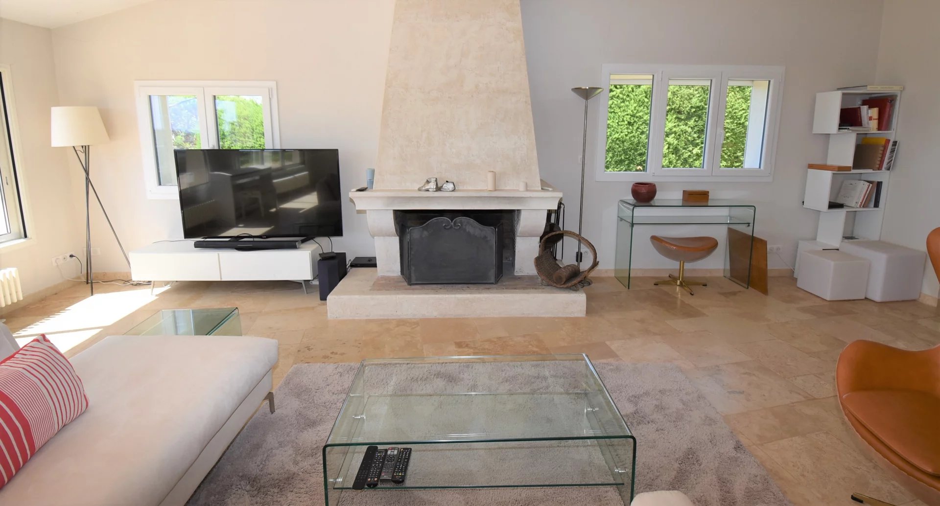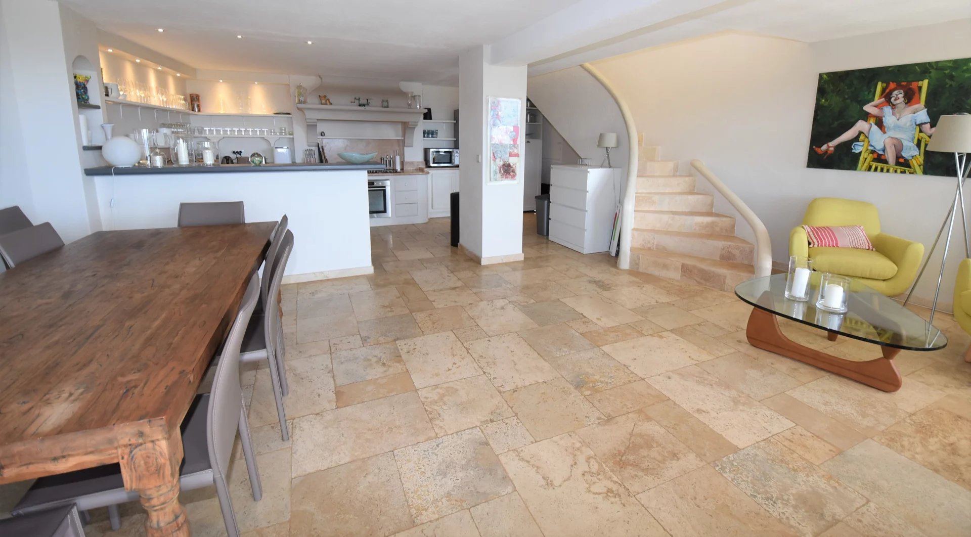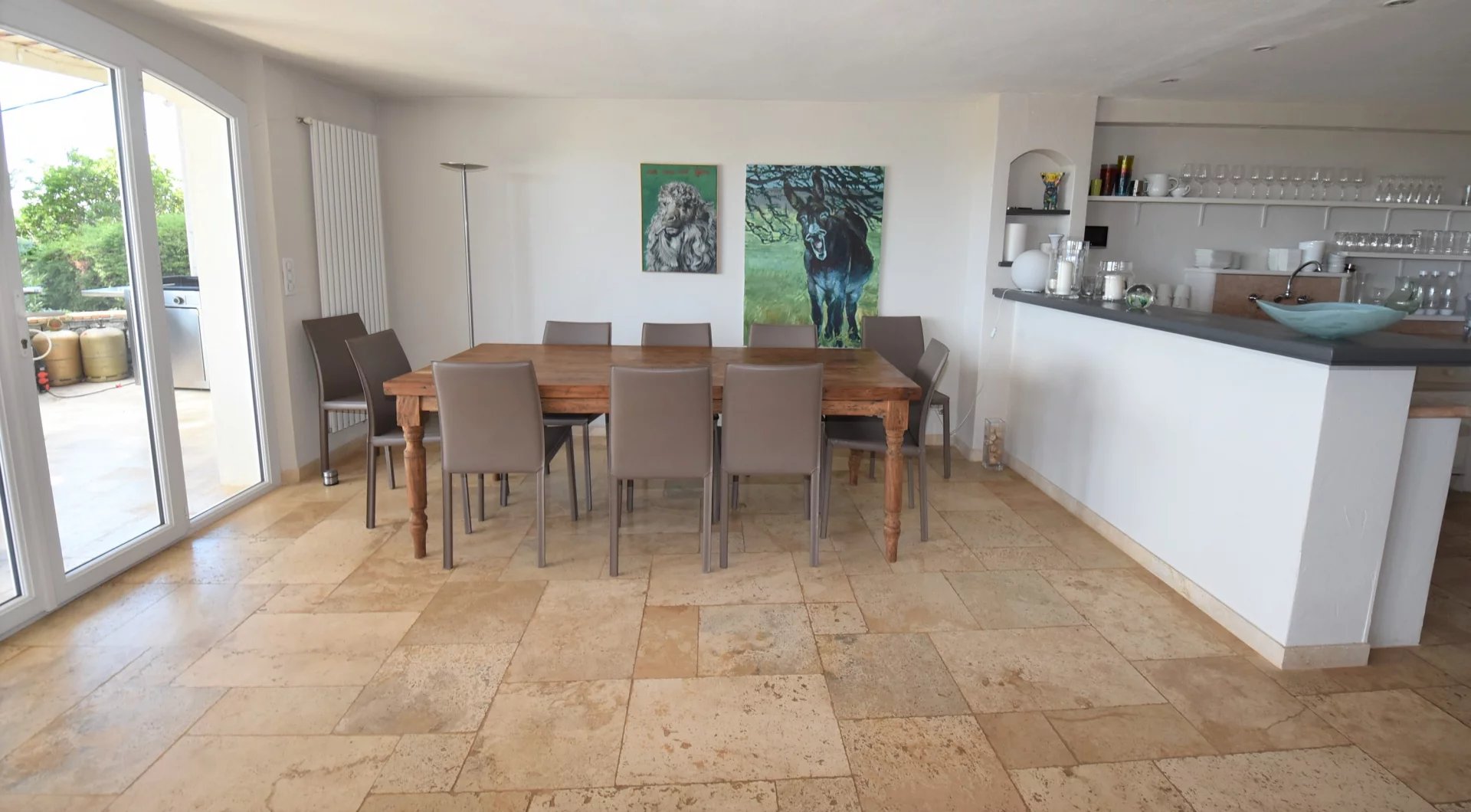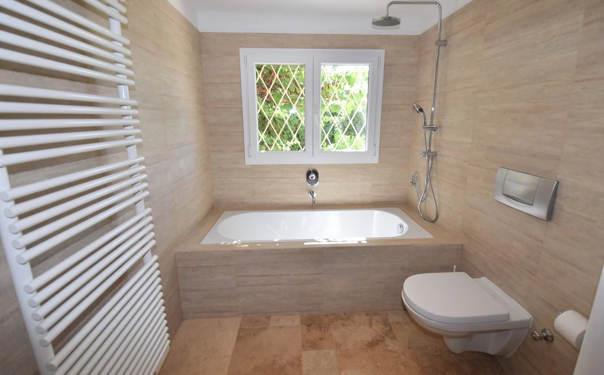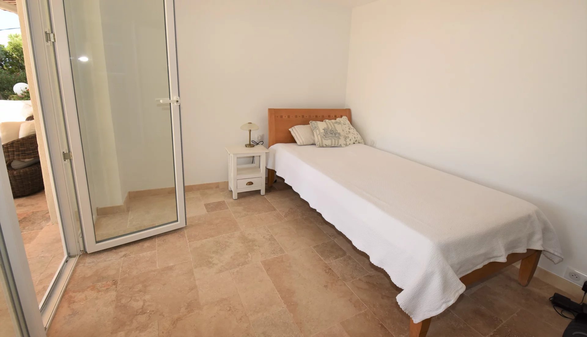 En position dominante, bénéficiant d'une vue panoramique sur la mer et les collines, villa individuelle comprenant un séjour avec une belle cuisine attenante, donnant sur une grande terrasse, en partie couverte. A l'étage, un salon avec cheminée, quatre chambres, toutes avec salles de bains ou douche et terrasses. Une dernière chambre toujours avec salle de douche, accessible par l'extérieur. Une grande buanderie, cave, garage fermé avec porte motorisée et parking avec portail électrique. Climatisation réversible dans toutes les pièces. Terrain paysager avec une belle piscine entourée d'une grande terrasse pour profiter de la splendide vue. Inclus dans le loyer, l'entretien du jardin et de la piscine.